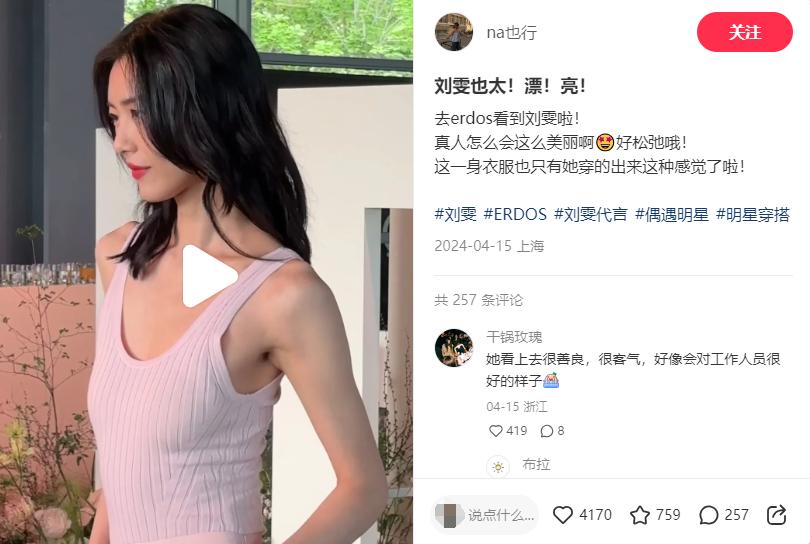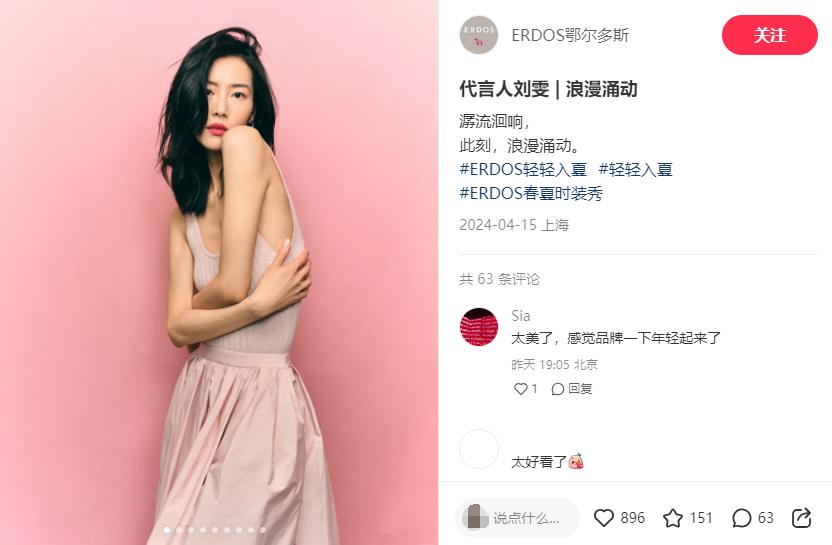 刘雯这回博足版面,是作为代言人出席ERDOS鄂尔多斯的春夏时装秀。代言人惊艳,品牌跟着出圈,羊绒老气横秋的刻板印象在这一刻被打破,“感觉品牌一下年轻起来了”。
