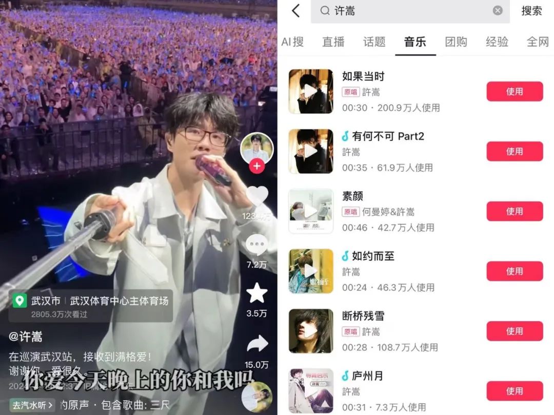 国内歌手里,景气指数主要看此前的供应稀缺度以及现在的短视频热度。比如QQ音乐三巨头之二的许嵩、汪苏泷,疫情前演唱会开得都不多。许嵩2022年前只开过7次演唱会,而他的歌又在短视频上很火,《如果当时》在抖音的使用人数达200万。其演唱会势头强劲也就不难预料了。