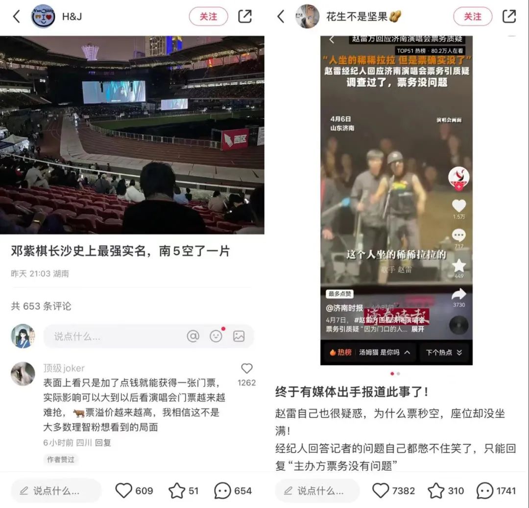 一时间不知该如何回复的硬糖君,想起了前些天确实看到,不少热门售罄演唱会被爆上座率实低。比如,邓紫棋长沙演唱会被指某区空座率很高,赵雷更自己在济南演唱会上吐槽:“人坐的稀稀拉拉,但票确实没了。”