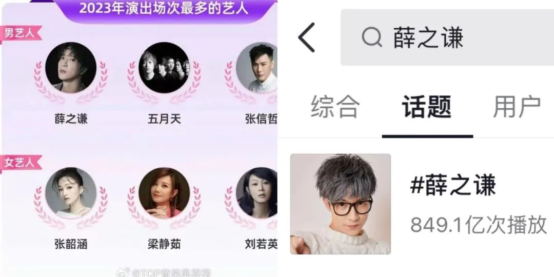 薛之谦在2016年因为《演员》事业有了起色,但2017-2019年也只开过两次巡演,市场并未饱和。2019年,薛之谦开始在抖音上以搞笑风格走红,个人的抖音话题播放量达849亿,华语歌手里,流量仅次于周杰伦。