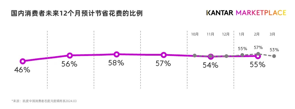 凯度2024年第一季度最新数据显示,在17个品类的节省花费预期上,52%的中国消费者预计在未来12个月节省花费,同比上涨五个百分点,环比去年四季度上涨三个百分点。