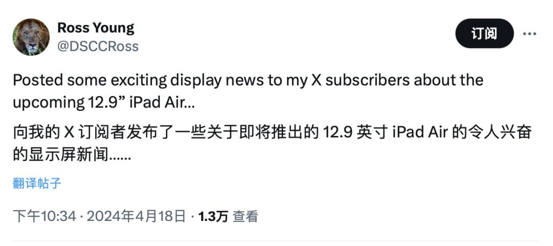 Ross Young 表示,新款 12.9 英寸 iPad Air,将采用与当前 12.9 英寸 iPad Pro 型号一样的 Mini-LED 显示屏。