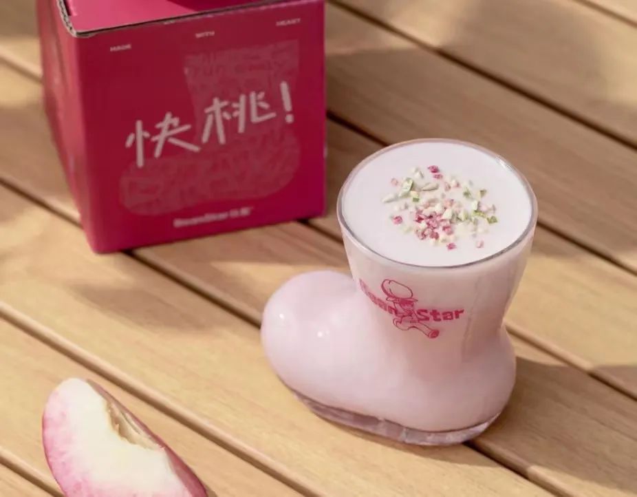 4月12日,比星咖啡上线蜜桃系列新品,采用了限定“逃逃杯”。靴子外形的玻璃杯,装入粉色的蜜桃饮品,看起来像一个粉色的小雨靴。