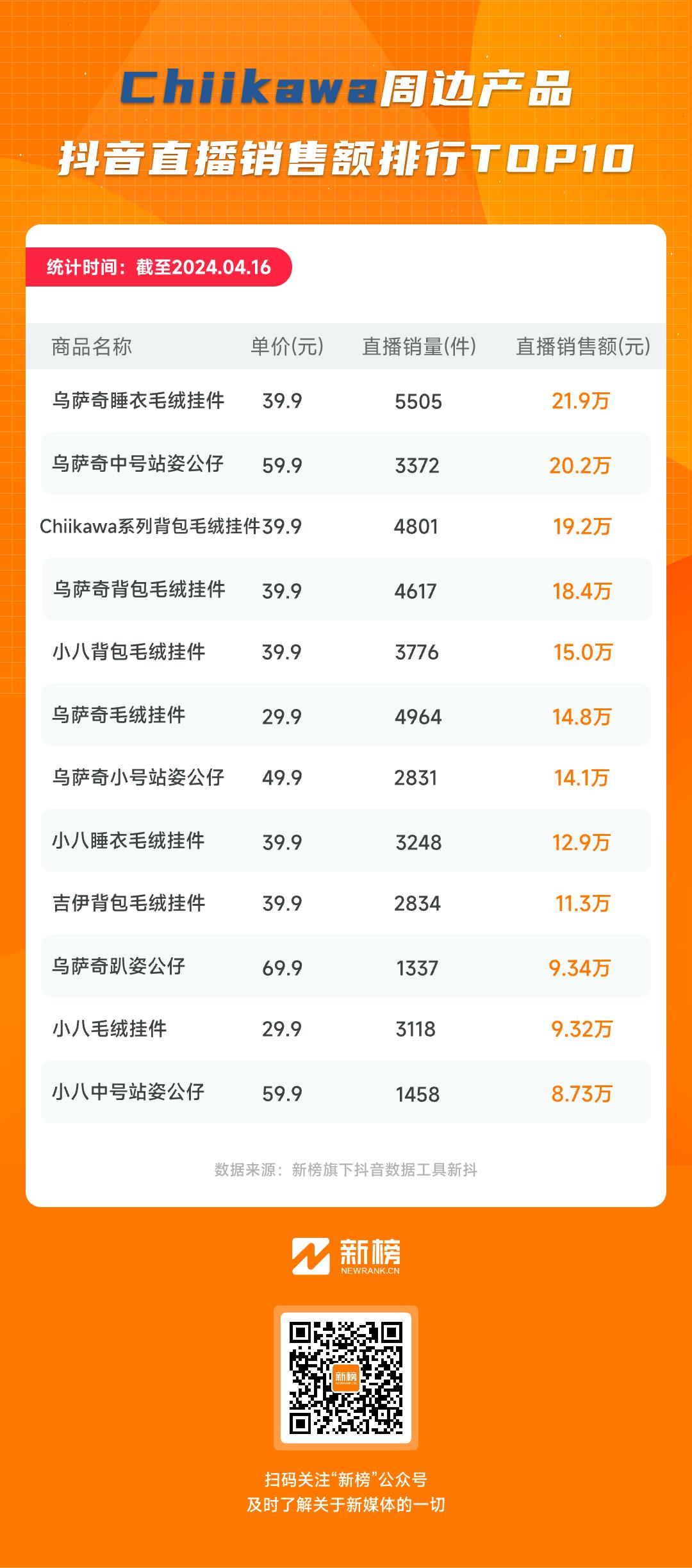 据新抖数据统计,Chiikawa睡衣系列挂件、中号站姿公仔、背包毛绒挂件等单品的直播销售额均突破了10万元。其中乌萨奇睡衣毛绒挂件销售额最高,单价39.9元,线上累计销售额近22万元。