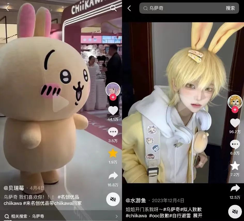 不少网友分享Chiikawa相关内容都拿到了不错的流量,有人玩起了Chiikawa的二创,比如用乌萨奇的怪叫声给大家带来一首rap,抖音获赞86.8万次;也有人做Chiikawa的cos内容,比如“水游鱼”cos乌萨奇,在抖音上被点赞了96.2万次。