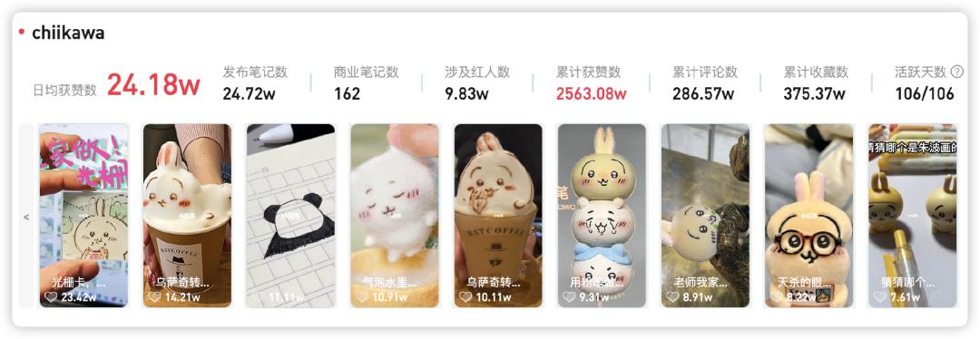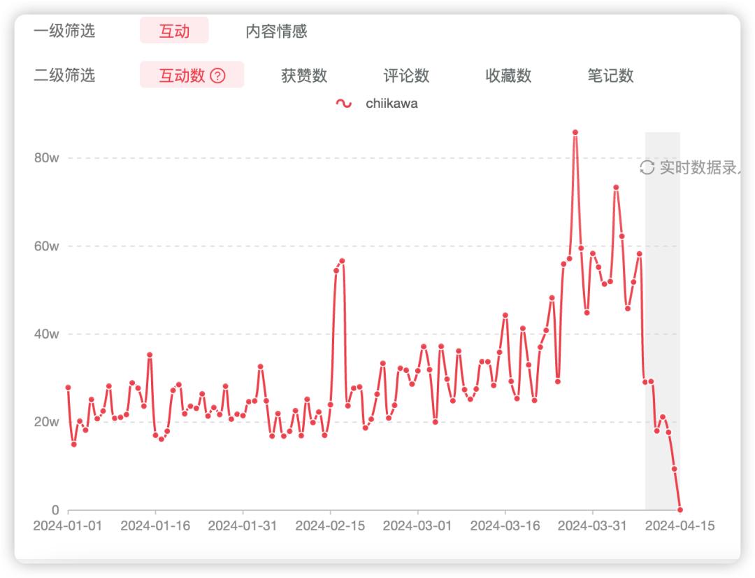新榜旗下小红书数据工具新红显示,小红书上今年以来(1月1日-4月15日)Chiikawa相关笔记数达到24.7万条,累计获赞达到2563万次,日均获赞24万次。