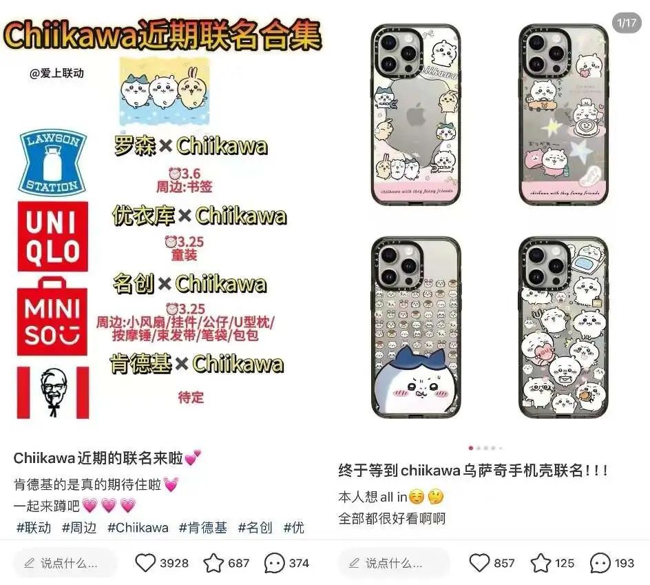 看中这波流量的品牌不止名创优品,据了解,GU、罗森、优衣库、SPAO、肯德基都已经或是计划与Chiikawa联名,来自香港的手机壳品牌Casetify也已经上线与Chiikawa的联名款。