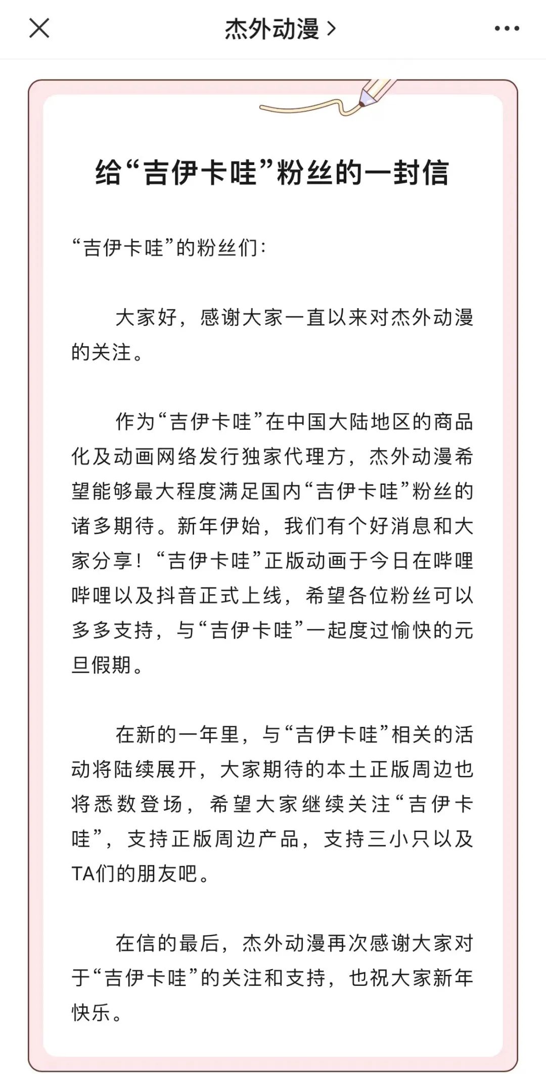 2024年初,国内版权独家代理公司杰外动漫发文《给“吉伊卡哇”粉丝的一封信》,宣布正版动画正式在B站和抖音上线,并表示本土正版周边也会悉数登场,相关活动将陆续展开。
