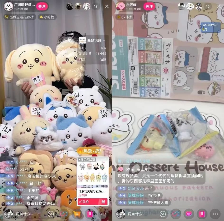 二手买卖平台闲鱼上代购高价售卖日本周边,抖音直播间里卖潮玩的、拆卡的,都带上了Chiikawa的话题,小红书上有许多Chiikawa相关的原创手作,比如蛋糕、毛毡、手机支架等等,多则卖出了上千单。