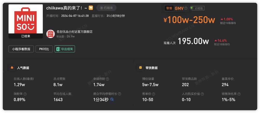4月7日的直播更是冲到了近期流量新高点,观看人次超过195万,带货GMV打到100万-250万元,基本上靠Chiikawa周边完成。