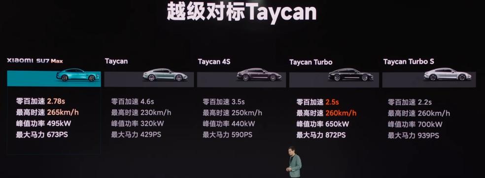 与小米不同的是,众泰SR9的性能、技术、设计等方面是彻彻底底的“山寨水平”,而在小米汽车发布会中,雷军将SU7 Max越级对标保时捷,性能上超越多款Taycan车型。