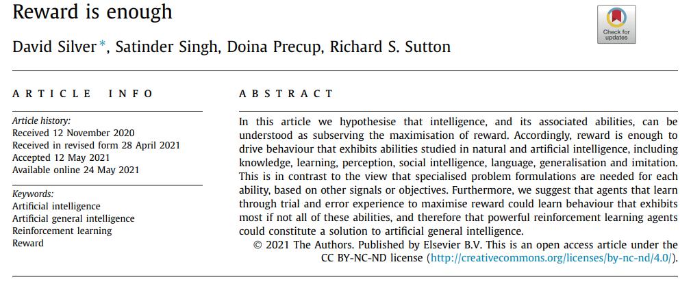 也有论文指出,「智力及其相关能力可以被理解为促进奖励最大化」。