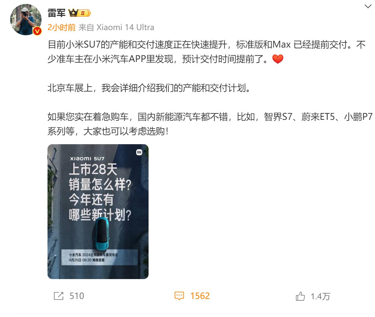 或许正因如此,智界汽车才会推出活动,为小米SU7大定用户支付5000元定金补偿,以求抢夺小米汽车消费者。面对友商的竞争,雷军倒是显得格外淡定,在微博表示已努力提升小米SU7的产能和交付速度,标准版与Max版均已提前交付,若是消费者急于购车,也可以选择智界S7、蔚来ET5、小鹏P7等车型。