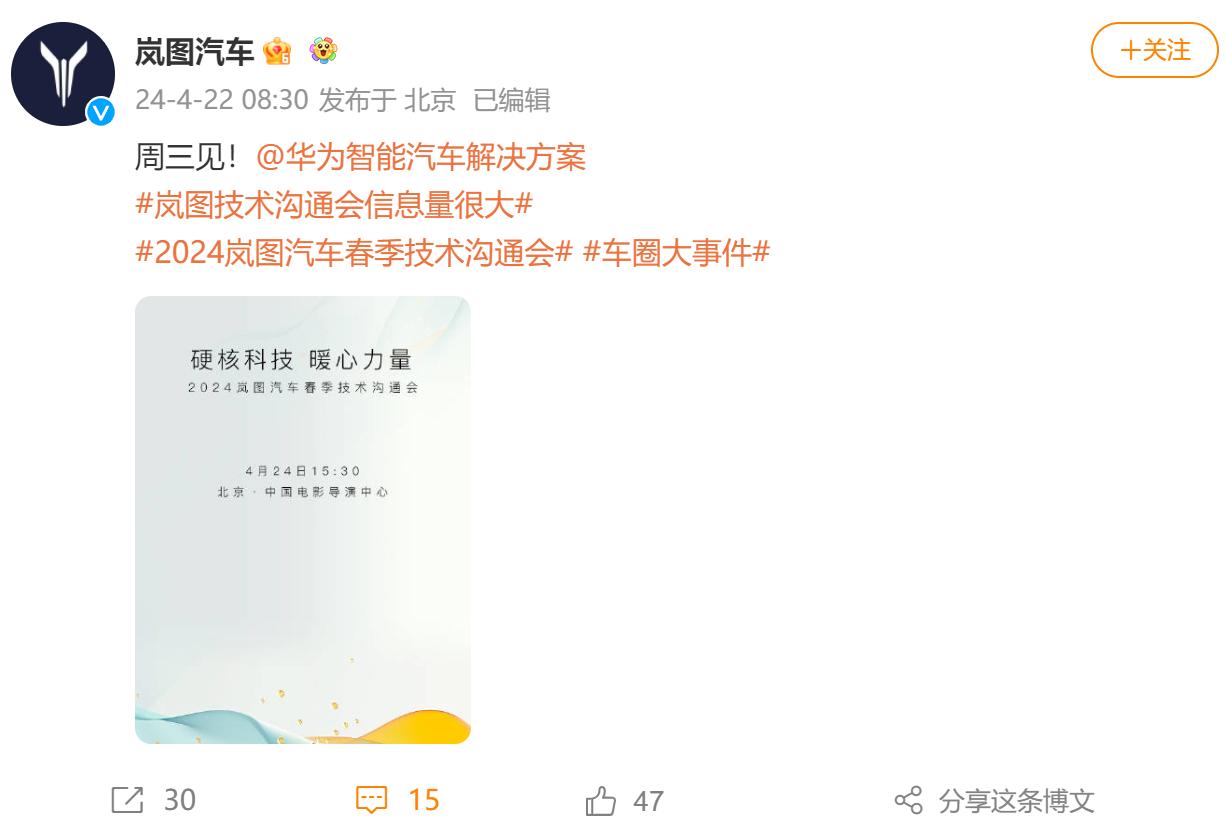 除了鸿蒙智行之外,华为车BU之下的另一个合作模式也有大动作,日前华为智能汽车解决方案官网上线,4月22日又在官微@数家合作伙伴,宣布将于4月24日召开智能汽车解决方案发布会。