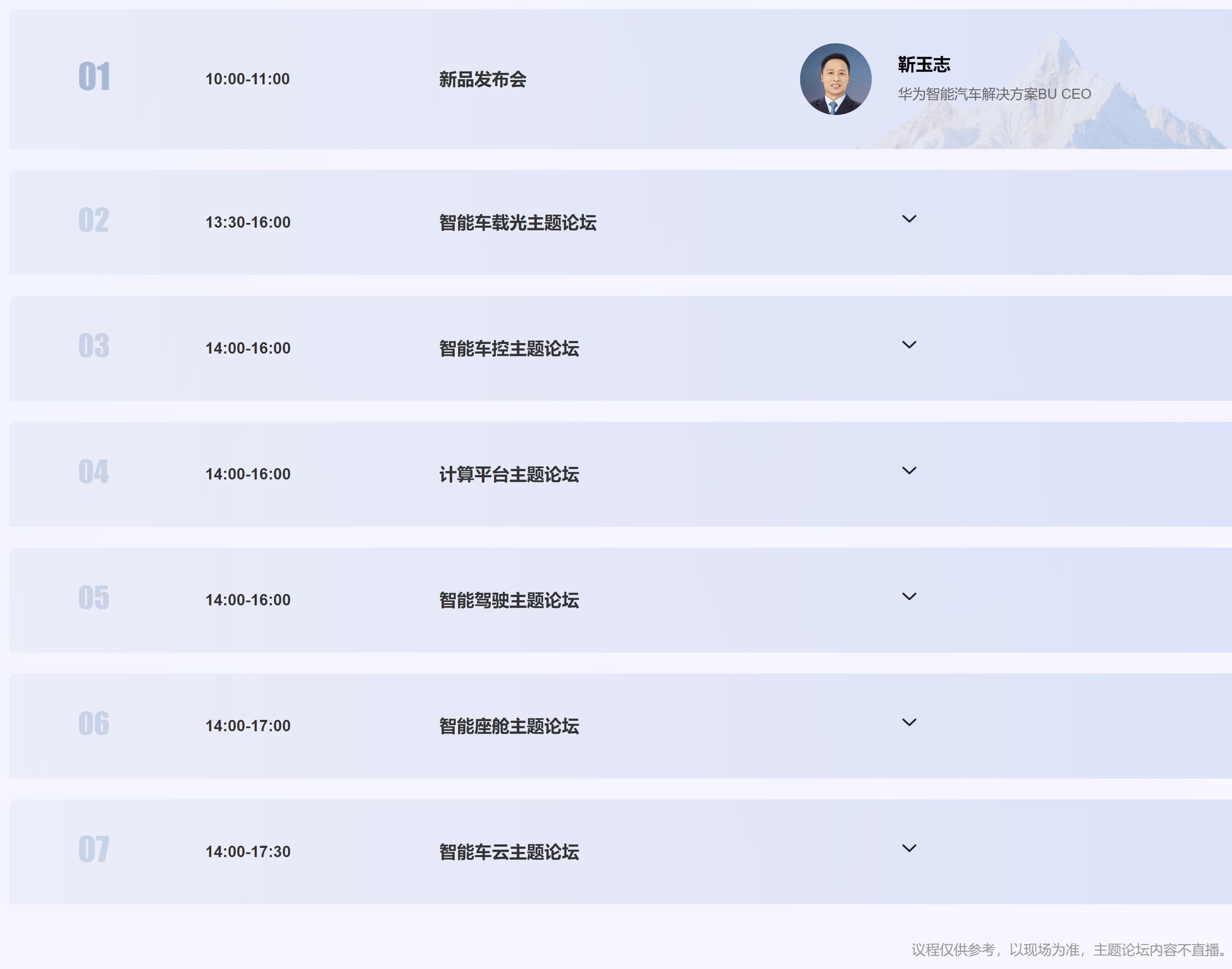 按照华为@合作伙伴的动作来看,此次发布会大概率面向Hi模式的合作伙伴。华为公布的会议流程则表明,智能汽车解决方案发布会主要有智能车载光、智驾、智控、智能座舱、云服务等方面,依然围绕智能化方向。