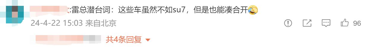 对于雷军的“慷慨建议”,大多数吃瓜群众的态度是赞扬雷军“有格局”,但也有网友表示,雷军的潜台词是“这些车虽然不如小米SU7,但如果你等不及了也能勉强开。”