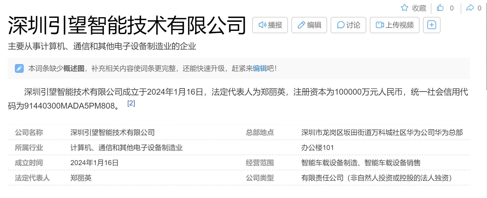 今年1月16日,华为在深圳市注册了一家名为“引望智能技术有限公司”的子公司,注册地位于华为总部办公楼,经营范围涉及车载设备制造、人工智能开发、汽车零部件研发等,由郑丽英担任法定代表人。随后,引望智能又在东莞、南京、苏州、上海、杭州五个城市设立了子公司。