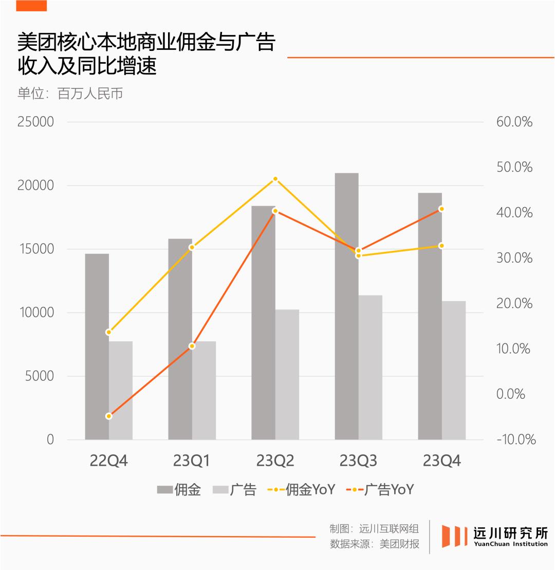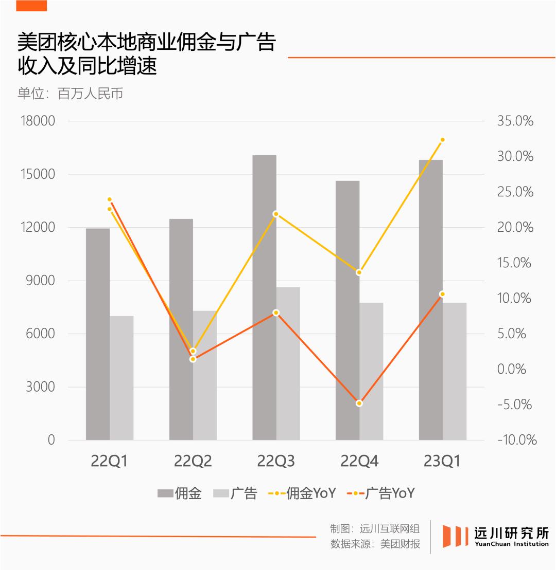 2022年下半年,美团核心商业板块的广告收入增速开始跟不上佣金,差距一路扩大,到了去年一季度,广告收入已经增速落后佣金超过20%。