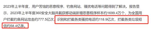 从 360 发布的《 2023 年上半年度中国手机安全状况报告》 中显示,光是 2023 年上半年,360 安全大脑就拦截了 118.9 亿次的骚扰电话!