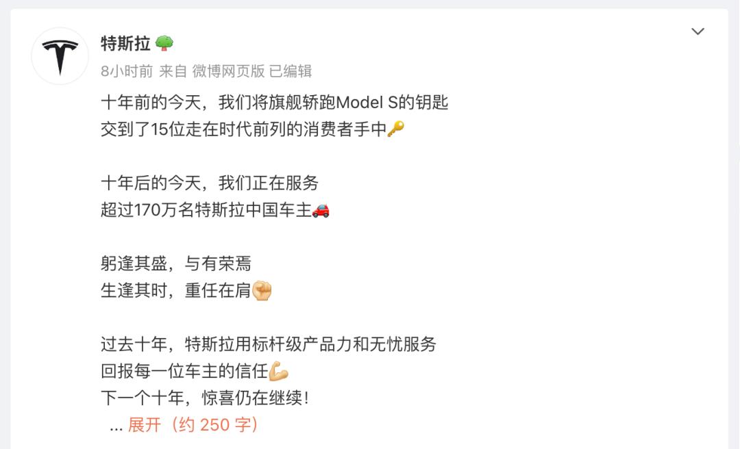 今天(4 月 22 日)上午,特斯拉官方发了一条庆祝特斯拉入华十周年的微博,“十年前的今天,我们将旗舰轿跑 Model S 的钥匙,交到了 15 位走在时代前列的消费者手中;十年后的今天,我们正在服务超过 170 万名特斯拉中国车主。”