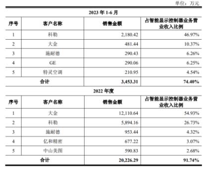 晶华电子的智能控制器业务,外似“春光正好”,实则“暗藏危机”。2022年度,智能显示控制器业务收入中,大金独自贡献54.93%,这一数据到2023年上半年、已缩减至10.37%。晶华电子表示,主要原因系2023 年上半年,全球经济下滑,大金等客户推迟了 2023 年度产销量计划。作为核心业务单元,智能显示控制器的增长可持续性、良性发展程度有待考究,未来想象空间有限。