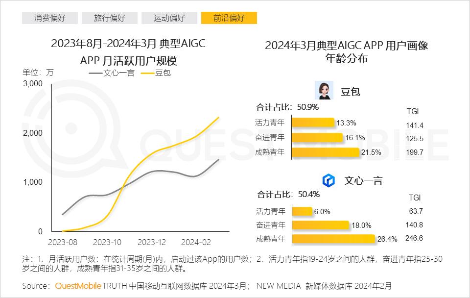 同时,不同年龄段偏好也呈现细微差异,19岁到24岁更具活力,对演出、手游、理性消费更为偏好;25岁到30岁表现出更强的奋进精神,商务办公、生活服务、AIGC新技术等活跃度都很高;30岁到35岁则表现出成熟偏好,百度贴吧、盒马、闲鱼等是热门应用,精致养生成为热词……