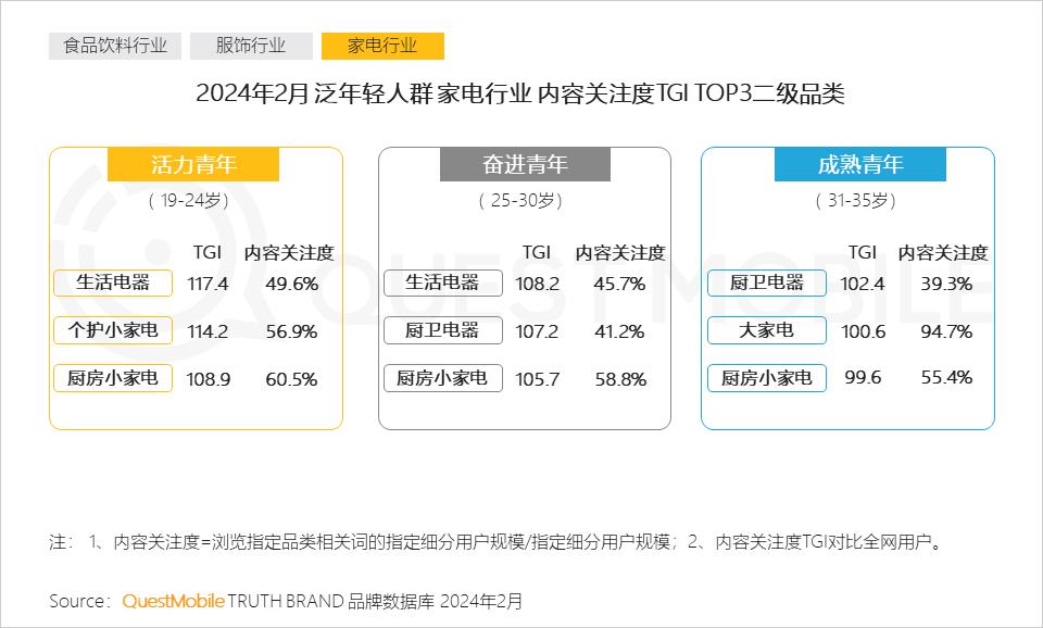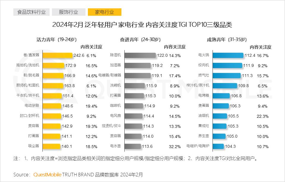 活力青年借助生活电器与个护小家电,实现自身形象和生活的精致管理;奋进青年通过生活类电器营造舒适的室内环境;成熟青年则倾向打造当代厨房,推动建立更健康的家庭饮食模式。