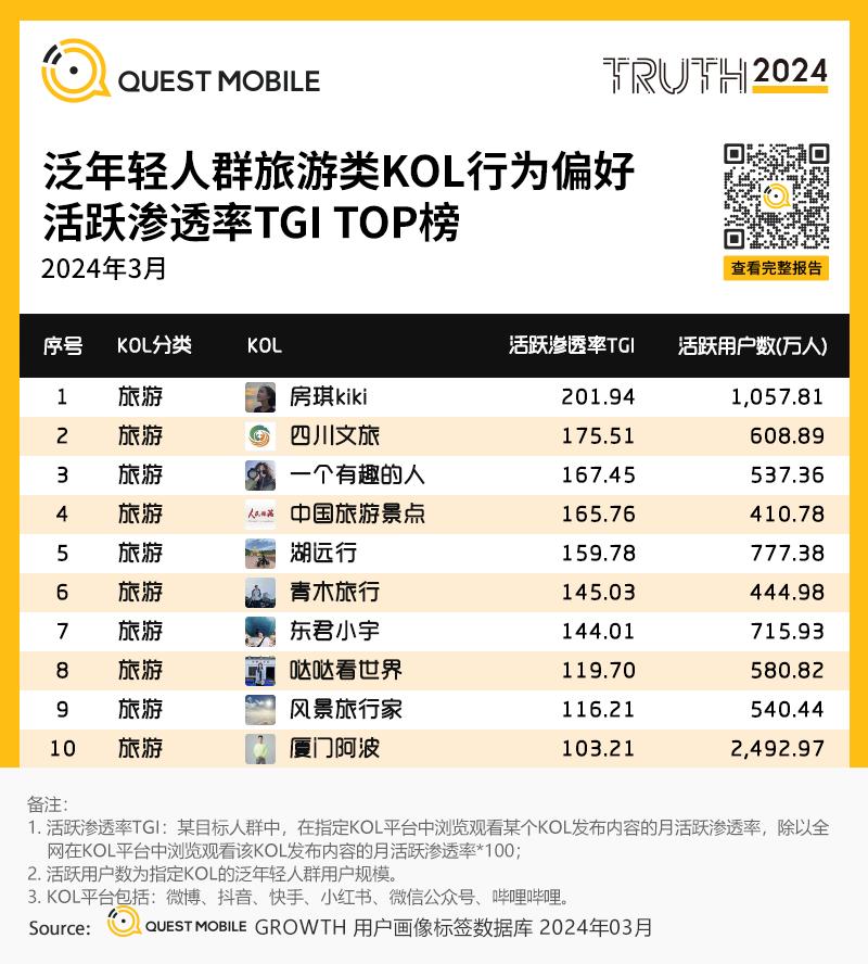 5、泛年轻人群旅游类KOL行为偏好活跃渗透率TGI TOP榜