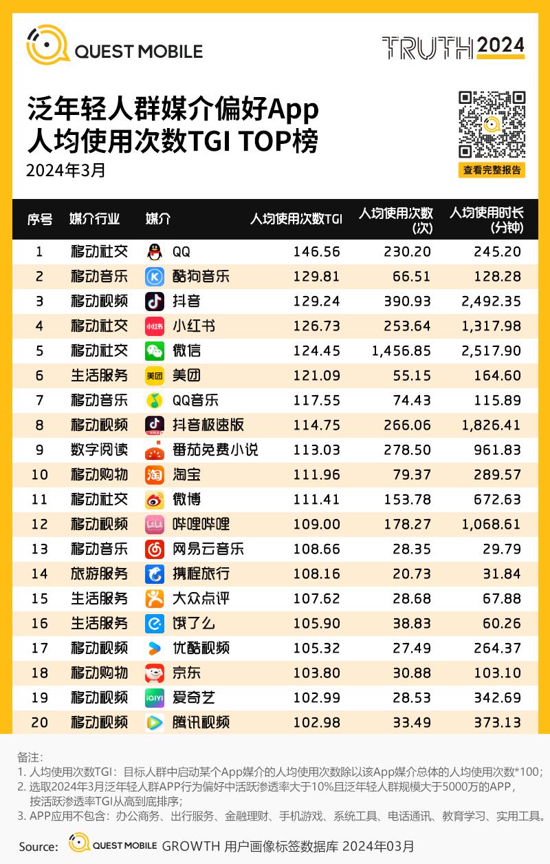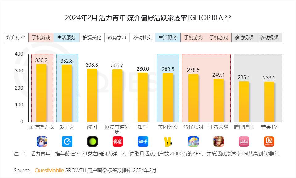1、泛年轻人群媒介偏好APP活跃渗透率TGI TOP榜