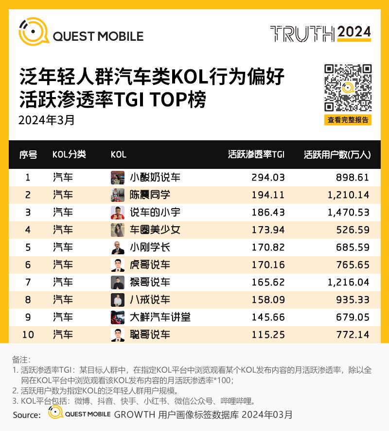 3、泛年轻人群汽车类KOL行为偏好活跃渗透率TGI TOP榜
