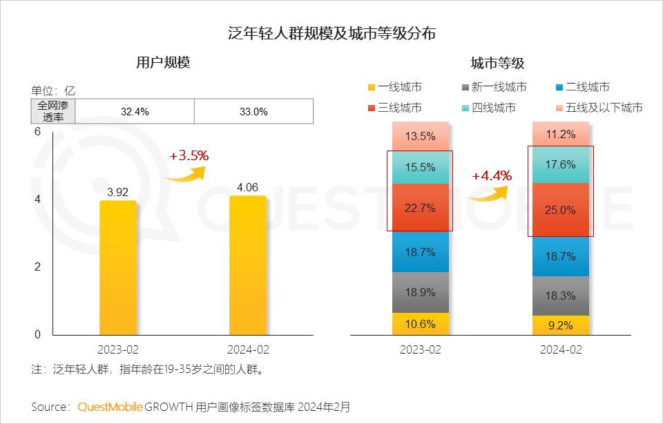 1.1 整体泛年轻人群规模超4亿,人群规模及全网渗透率趋于小幅增长,三四线城市对年轻人群吸引力增强