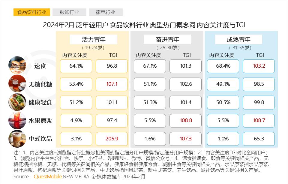 2、经济文化快速发展时期成长起来的活力青年,文化自信程度高,格外关注中式饮品内容;而奋进青年与成熟青年更对水果原浆、速食等便捷式食品“更感冒”
