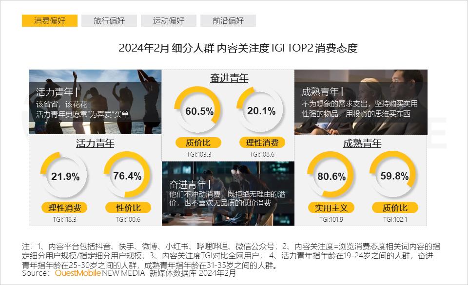 2.3 活力青年理性消费意识更强,奋进青年则理性与质价比共存,成熟青年更在意质量和实用消费主义