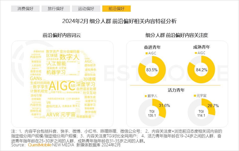 2.7 奋进青年与成熟青年,更追随当下热议前沿话题,如AIGC;活力青年更偏好数字人、元宇宙