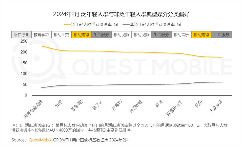 1、 泛年轻人群规模小幅攀升,移动购物与生活服务媒介更容易触达年轻人群