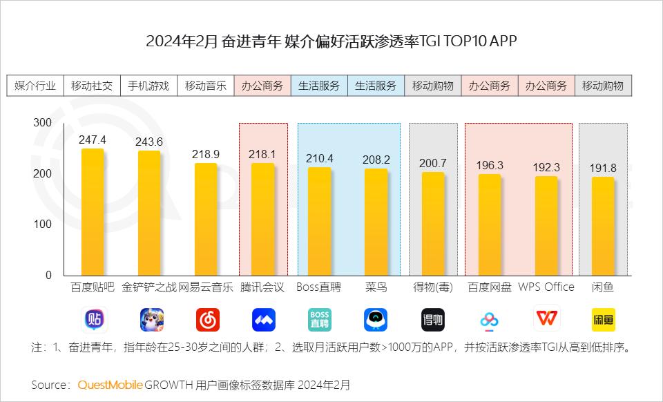 1.5 奋进青年处于工作爬坡期,商务办公、生活服务类应用渗透率更高