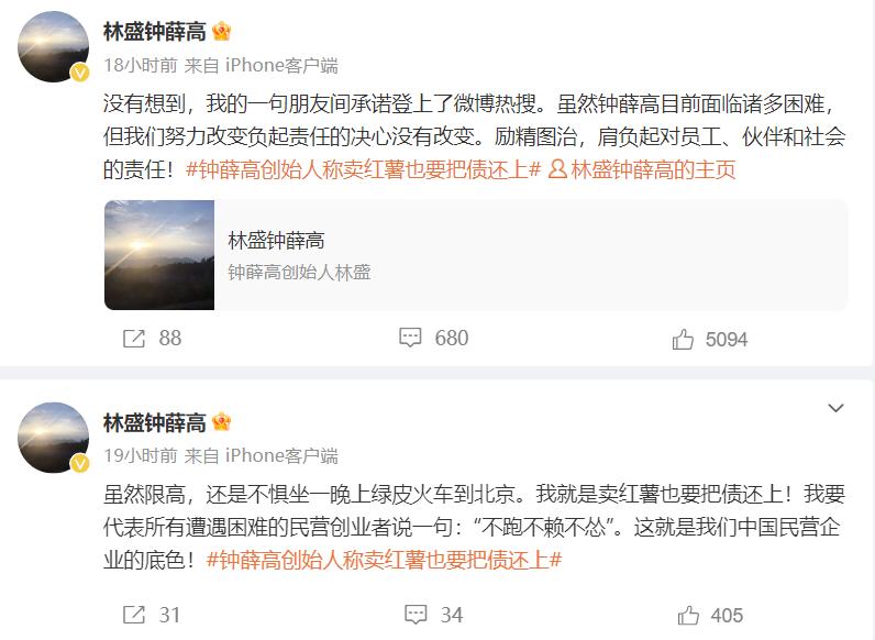 4月21日,钟薛高创始人林盛连发两条微博表示,“虽然钟薛高目前面临诸多困难,但努力改变负起责任的决心没有改变。”林盛表示,虽然(被)限高,还是坐一晚上绿皮火车到北京,就是卖红薯也要把债还上。
