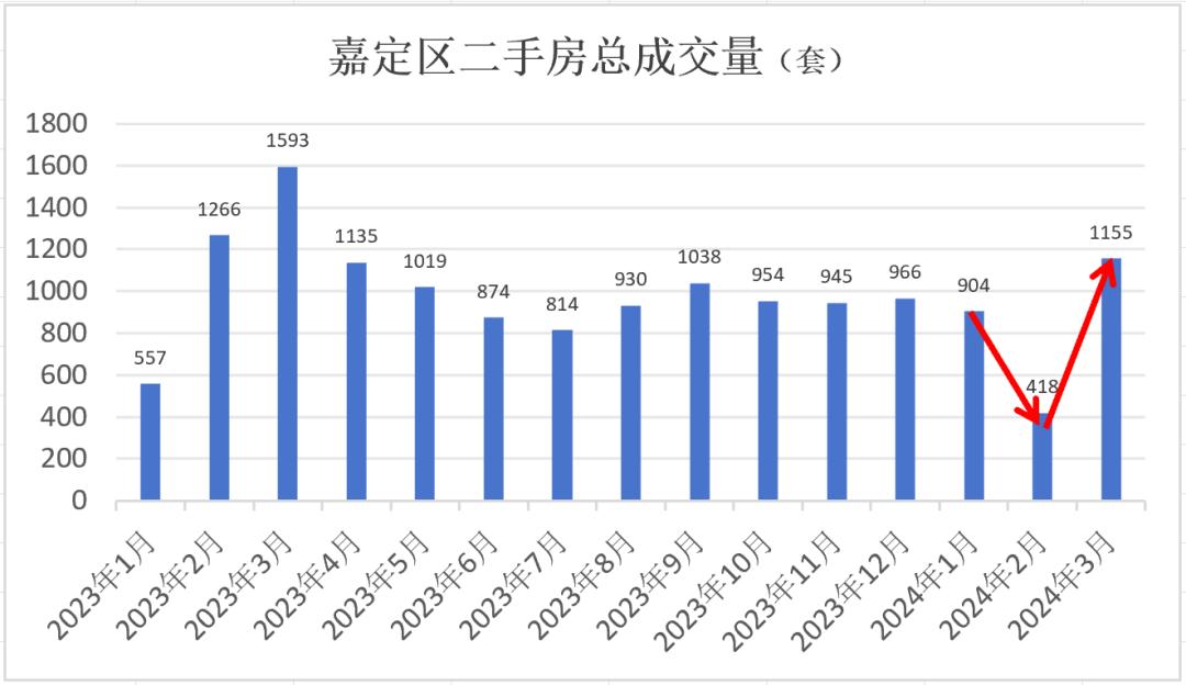 2024年3月嘉定二手房成交了1155套,不仅仅是比今年2月高出737套之多。