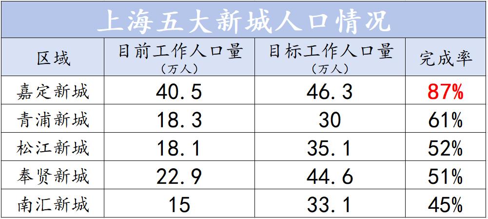 据统计,上海五大新城中,嘉定新城内工作人口已达40.5万,目标工作人口数是46.3万,完成率约87% 。