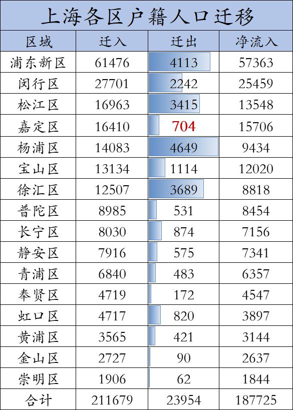 但在 迁出量 方面,嘉定却是这前五名里最少的,仅仅只有704人,甚至都没破千 。