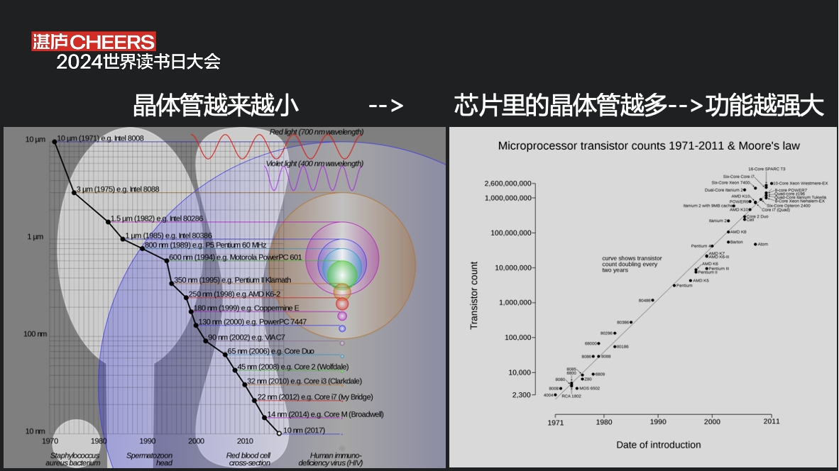 我们刚才提到,晶体管会越来越小,那逐渐变小之后有什么变化吗?下面这张图里面显示的是晶体管的尺寸,从最初的几十微米缩减到今天的3纳米,图中最大的、紫色的圆代表直径为10微米,我们的一根头发丝大概是50微米。然后它不断地缩小,到 1 微米,然后 0.1 微米,然后是0.01 微米……缩减到这个图里面最小的那个点,就比这个 HIV病毒的直径还要小。换句话说,通过我们的光学显微镜,无论多么先进的光学显微镜都看不到,因为可见光的波长最多是400纳米。而现在我们的芯片只有几十个纳米。那晶体管尺寸变小之后有带来怎样巨大的变化呢?就在一颗芯片上可以塞进更多的晶体管,就像一个书页上可以塞进更多的文字一样。举一个具体的例子,在这张图的一个左下角,是 1971 年发明的第一颗CPU 芯片,它上面只有 2 250 个晶体管,那它使用的尺寸是 10 微米,也就是一万纳米。
