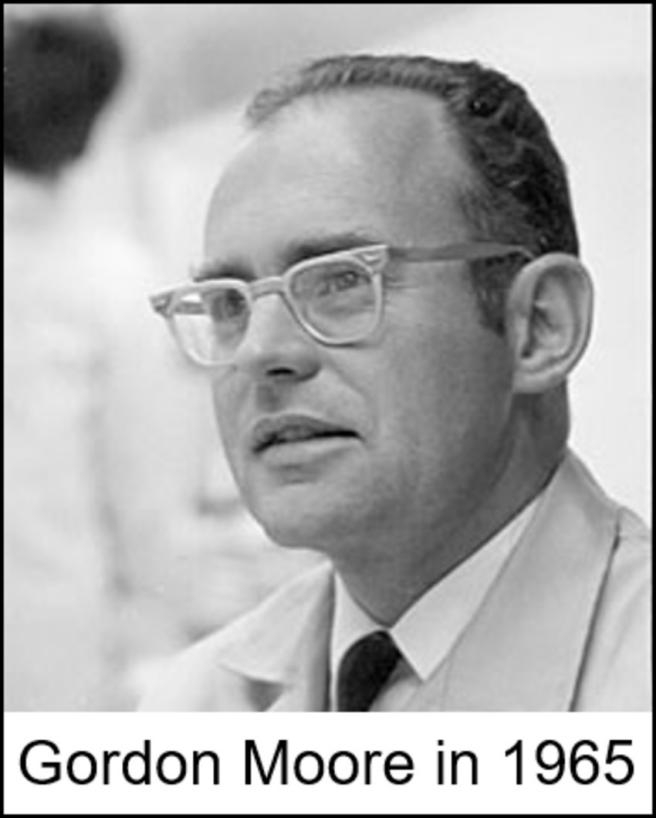 芯片发明出来之后,芯片上的元件数量就不断增加,到了1965年,就是7年之后,摩尔受邀写一篇文章,他总结了过去几年芯片发展的规律,发现每过一年,芯片上的元件数量就翻一倍,非常简单的一个规律,所以他就写成一篇文章发表出来了。这就是摩尔定律最初的一个表述,非常简单的一个定义。一开始是1,然后是2、4、8、16……这样逐渐翻倍。一开始的数量非常小,但这个发展的速度是指数倍的,到了40年、50年之后,这个数字将变得非常庞大。芯片产业发展的脚步是一直按照摩尔定律来向前推进的。