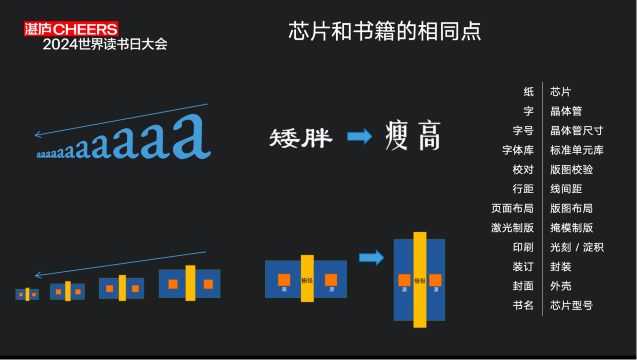 那我相信在现场有很多听众,比如说出版人员,对这些词会非常熟悉:校对、行距。印刷就相当于我们芯片制造中的光刻,最后的步骤是把它封装起来,就像把书装订起来。