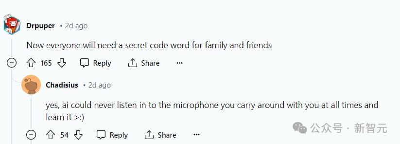 看完演示后,网友表示「每个人和家人朋友约定一个密码词」防止诈骗了,因为AI可以一直监听手机的麦克风来学习。