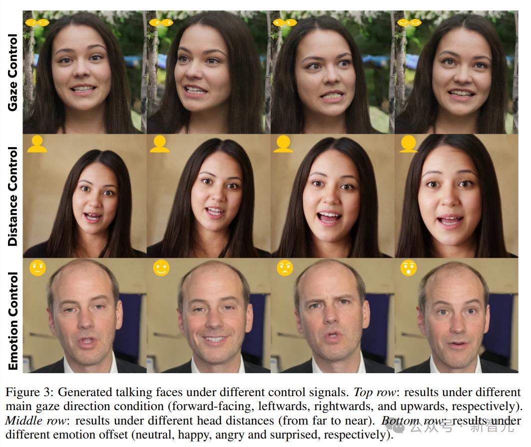 模型在生成过程可以接受一组可选的控制信号来指导生成,包括主眼凝视方向、头部到相机的距离和情绪偏移等。