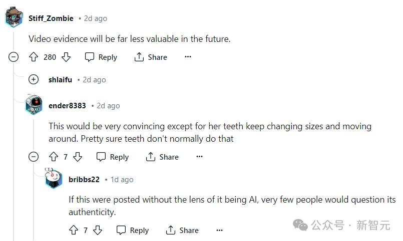 但也有网友指出,细看的话,视频也存在瑕疵,例如牙齿的大小一直在变化;但如果不知道这个视频是AI生成的话,不知道还能否分辨出来?