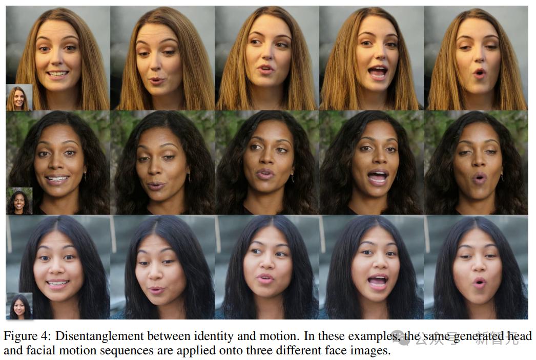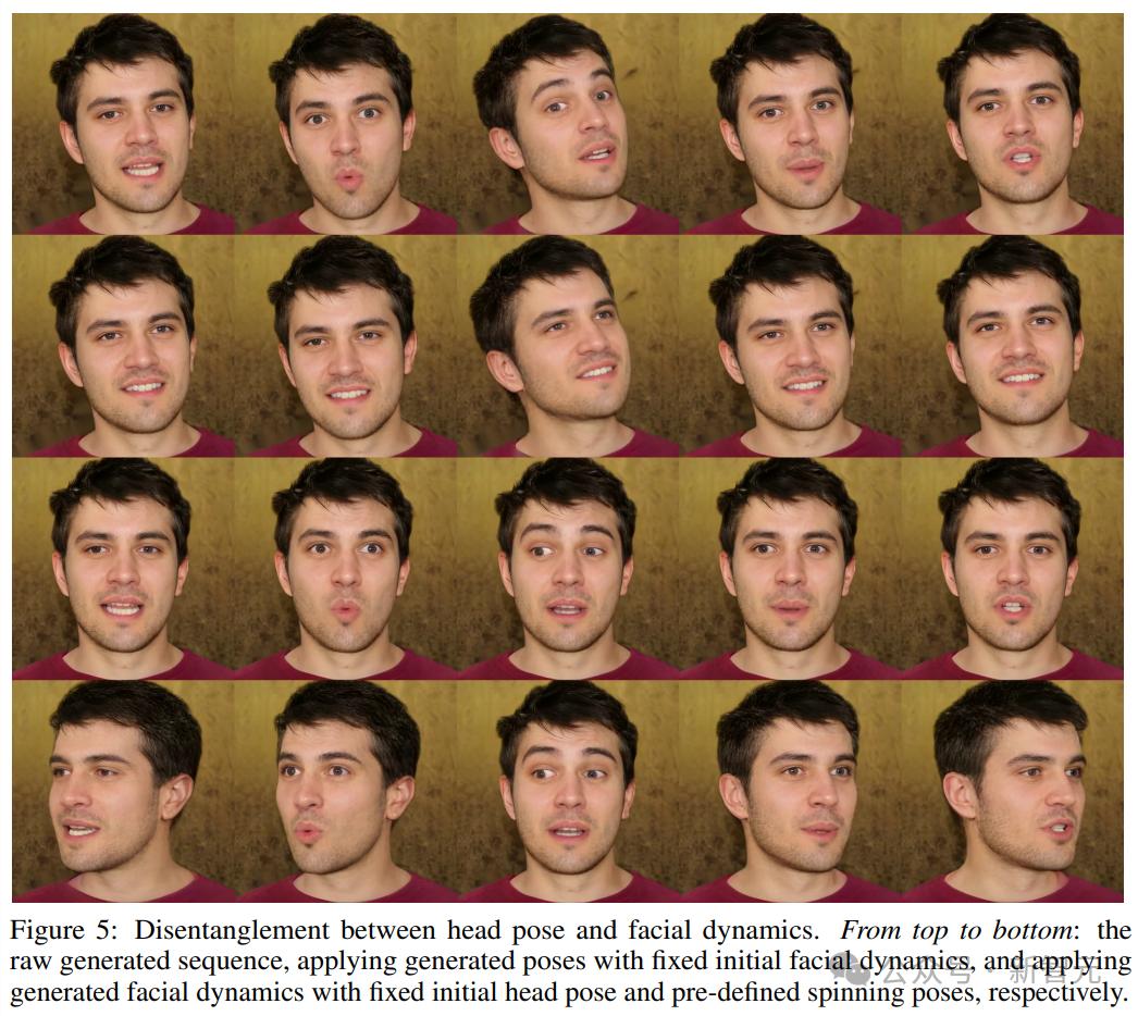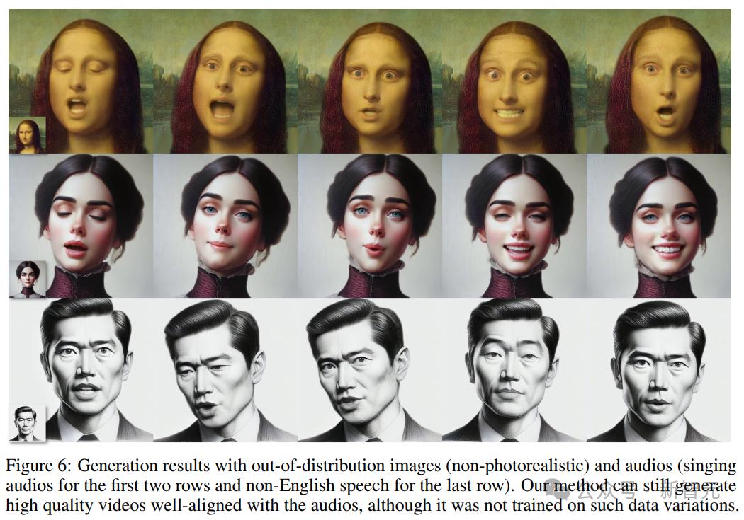 下图进一步说明了头部姿势和面部动态之间的有效解耦,通过保持一个方面不变并改变另一个方面,得到的图像忠实地反映了预期的头部和面部运动,而不会受到干扰,展示了处理训练分布之外的照片和音频输入的能力。