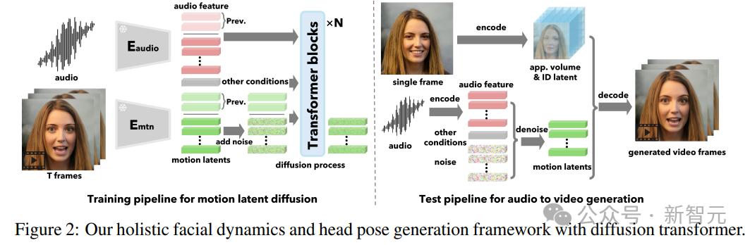 在这项工作中,研究人员利用音频条件下的HFDG的扩散模型,在来自大量身份的大量谈话人脸视频上进行训练,并将Transformer架构应用于序列生成任务。