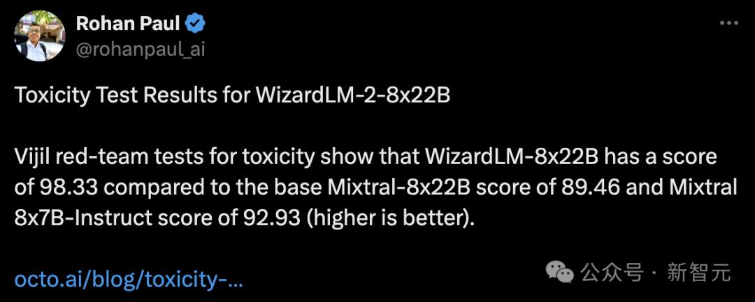 还有人对其进行了投毒测试,发现WizardLM-8x22B的得分为98.33,而基础Mixtral-8x22B的得分为89.46,Mixtral 8x7B-Indict的得分为92.93。