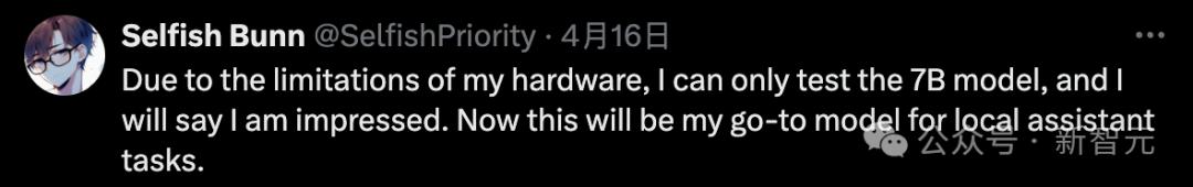好在测试的网友对7B模型感到印象深刻,并称这将是自己执行本地助理任务的首选模型。